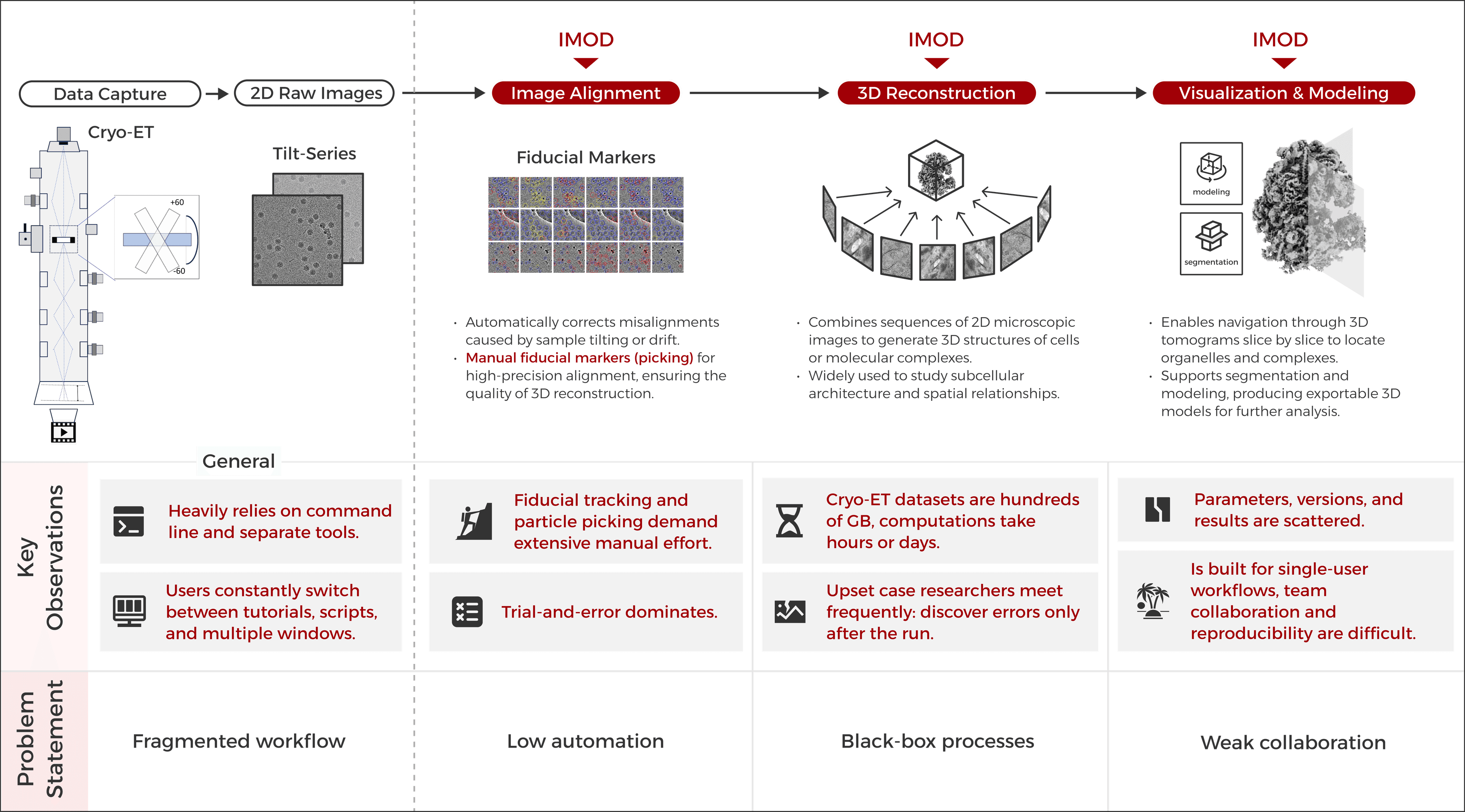 We mapped IMOD’s role in the workflow and identified 4 key bottlenecks: