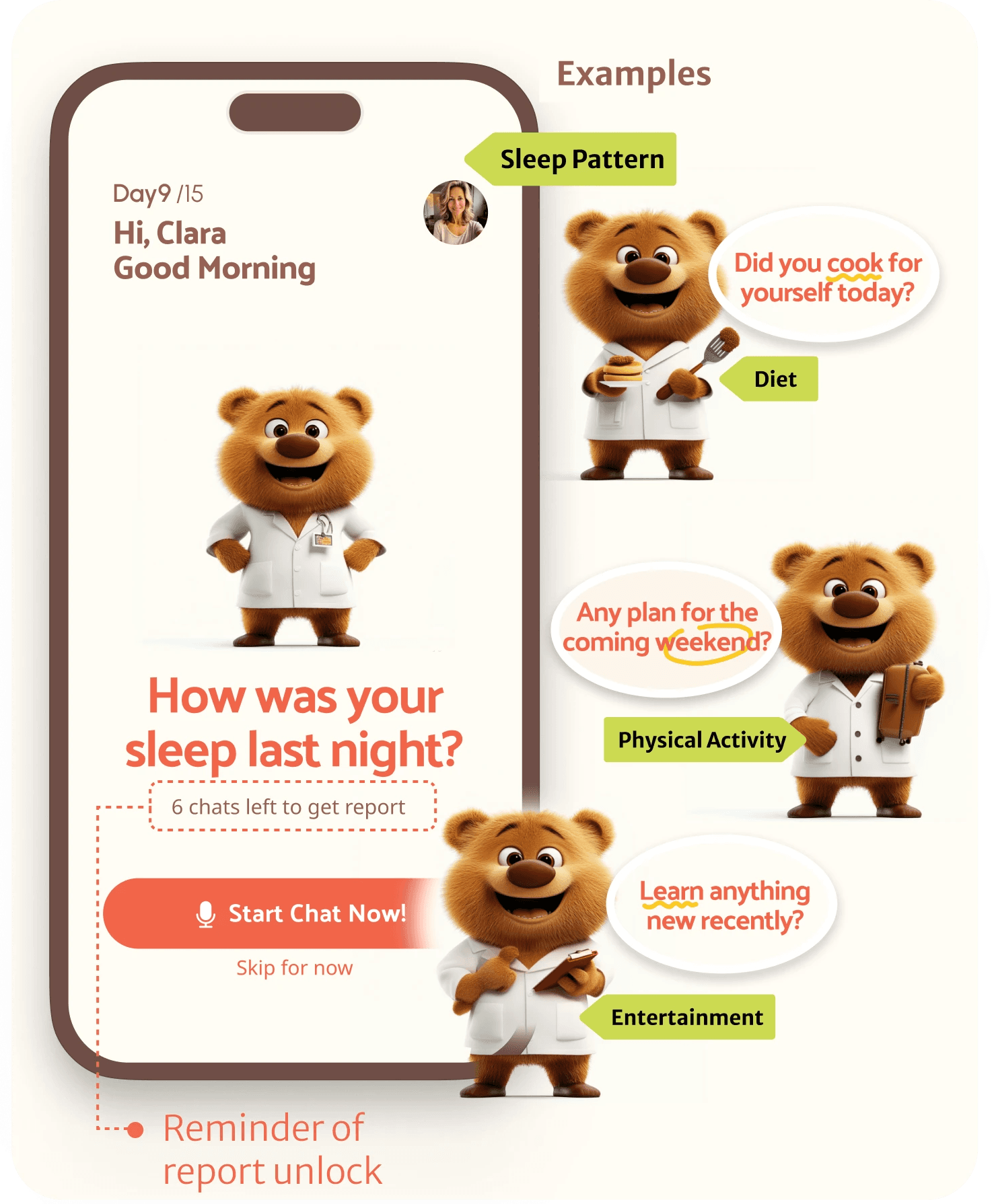 To make the experience feel more personal and inviting, I introduced a character-based conversation agent that fostered emotional connection and routine. By generating daily topics from iPhone Health data and adding expressive response animations, the experience felt more natural, engaging, and habit-forming.