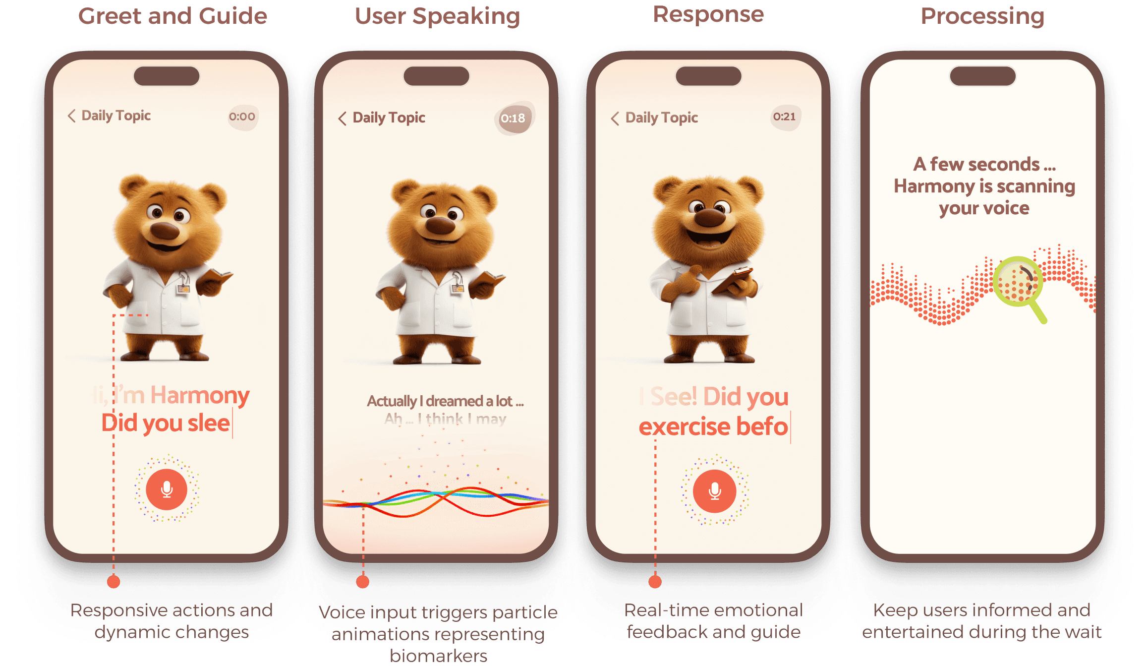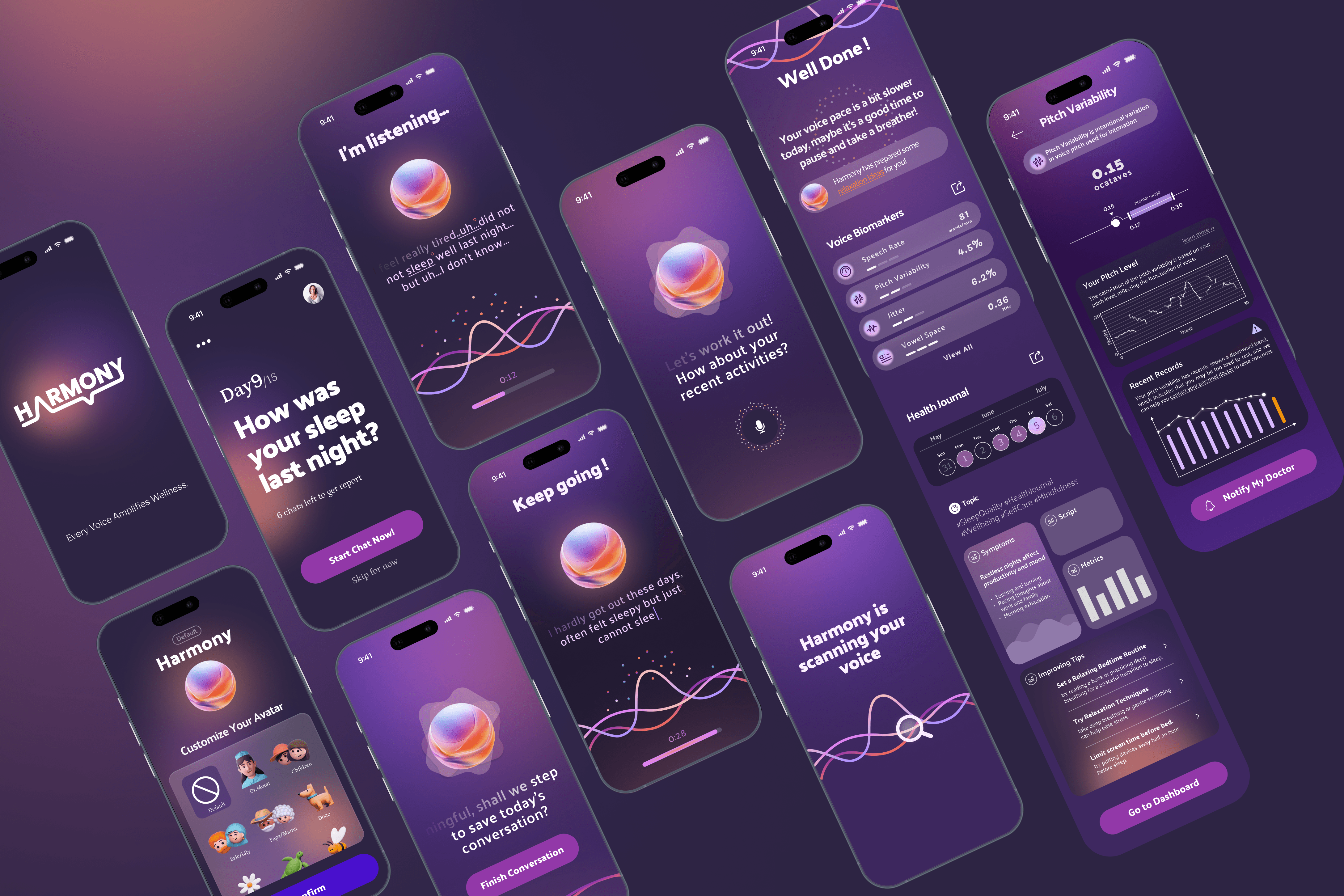 Harmony is a startup project at UC Berkeley, built on a voice biomarker ML model that analyzes speech patterns to detect early cognitive decline. My role on the cross-discplinary team was to translate this technical foundation into a clear, trustworthy, and emotionally supportive user experience.